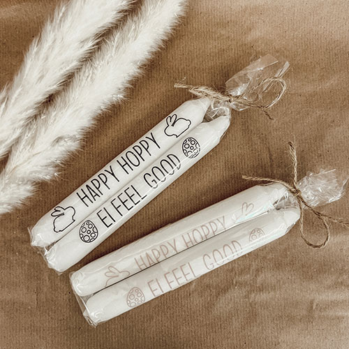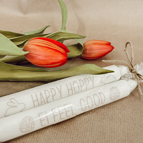 Die Kerzen sind mit einer bedruckten Wasserschiebefolie veredelt und mit einem Kerzenlack überpinselt, so brennen sie schön gerade ab und es bilden sich keine Druckrückstände oder giftigen Stoffe.