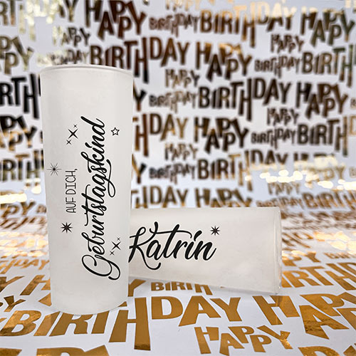 Feiere deinen Geburtstag mit unseren personalisierten Schnapsgläser. Oder verschenke sie an ein Geburtstagskind. Wir haben eine Vielzahl an Layouts vorbereitet, um dir Inspiration zu bieten. Natürlich können wir auch Schnapsgläser nach deinen eigenen Vorstellungen gestalten. Dann schick uns gerne dein Wunschlayout per Mail (info@zehnnullzwo.de) zu.