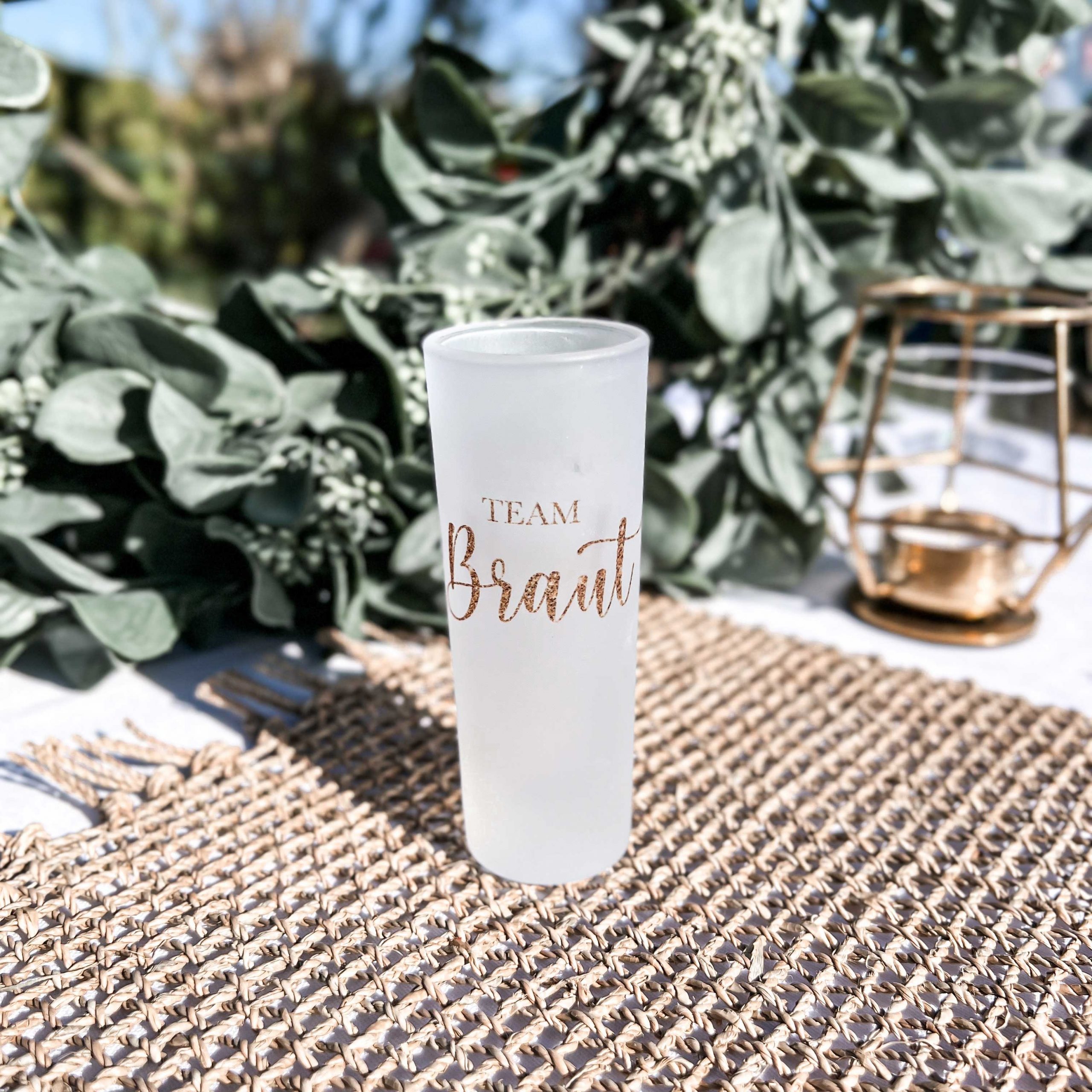 Das Schnapsglas ist zum Beispiel mit einem stilvollen und modernen „Team Bride“ Aufdruck verziert, der es zu einem echten Blickfang macht. Es hat die perfekte Größe für einen kleinen Schluck Schnaps oder einen Shot und eignet sich somit bestens für den Junggesellen- und Junggesellinnenabschied oder andere festliche Anlässe.